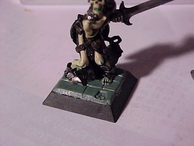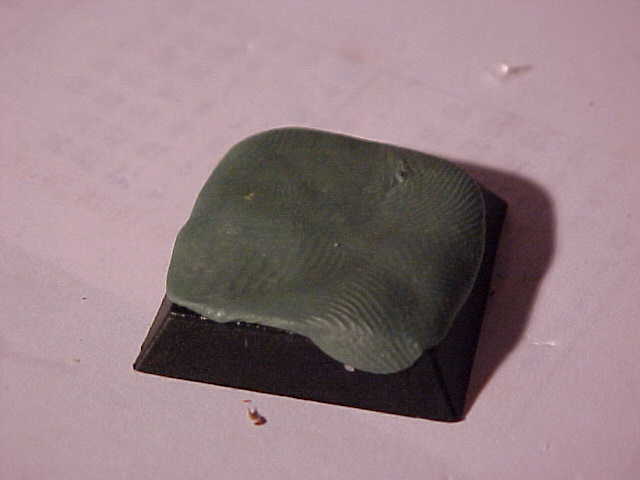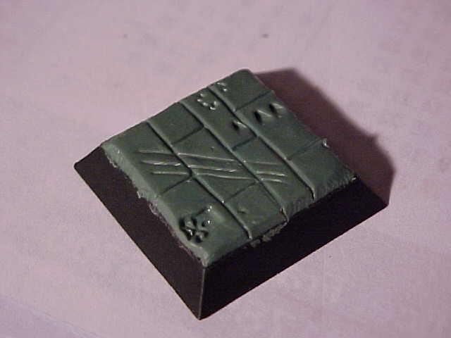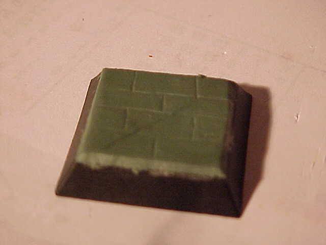Modelling Technique: Paved Bases For those who dont know, I've recently been getting into building walls in plaster for terrain and the game Confrontation by Rackham. I have a growing undead force, and in an attempt to do the bases differently from all my other bases have been trying a paved effect to go with my walls... This guide is designed for Square Bases, but I'm sure the techniques work on round bases (as I have done it!) Firstly, clean up the base, file off tabs and so on. Next up, I cover the entire base in Greenstuff. Style is of little importance, just make sure the entire top part of the base is covered.